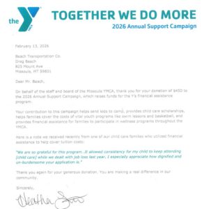 A letter arrived to us in the mail from the wonderful folks at the Missoula YMCA.