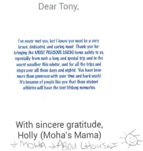 The card reads: “Dear Tony, I’ve never met you, but I know you must be a very brave, dedicated and caring man! Thank you for bringing the MOST PRECIOUS CARGO home safely to us, especialy from such a long and special trip and in the worst weather this winter, and for all the trips and stops over all these days and nights! You have been more than generous with your time and hard work! It’s because of people like you that these student athletes will have the best lifelong memories. -with sincere gratitude, Holly”.
